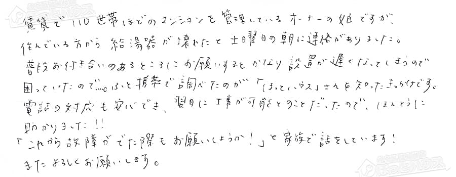 住んでいる方から給湯器が壊れたと土曜日の朝に連絡がありました。