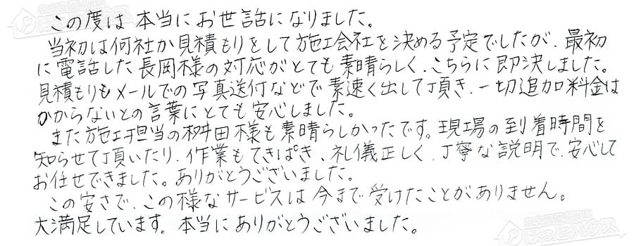 現場の到着時間を知らせて頂いたり、作業もてきぱき、礼儀正しく丁寧な
