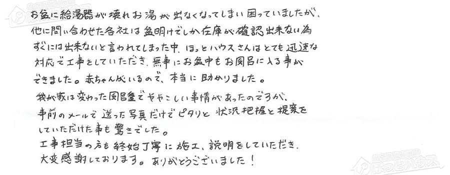 対応で工事をしていただき、無事にお盆中もお風呂に入る事ができました。