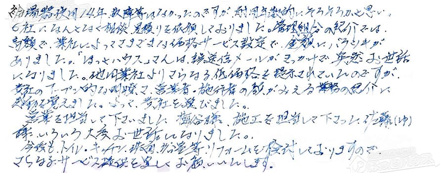 他用業社よりさらなる低価格を提示されていたのですが、貴社のオープン的な明瞭さ、営業者・施工者の顔がみえる業務の紹介に