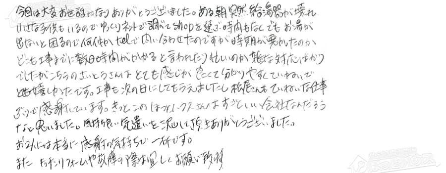 今回は大変お世話になりありがとうございました。ある突然給湯器が壊れ