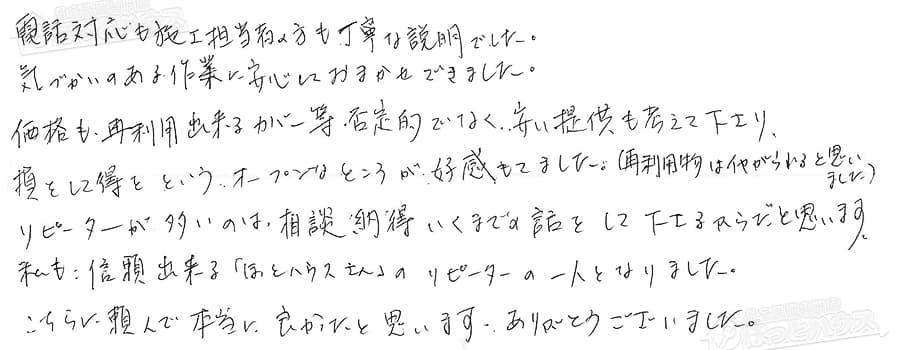 私も、信頼出来る「ほっとハウスさん」のリピーターの一人となりました。