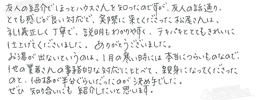 お湯が出ないというのは、1月の寒いときには本当につらいものなので、
