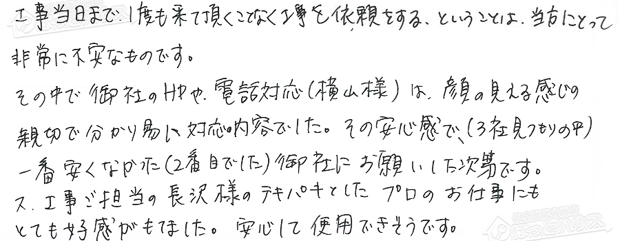 工事当日まで、1度も来て頂くことなく工事を依頼をする、ということは、当方にとって