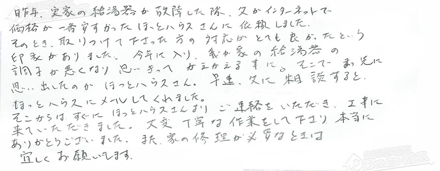 価格が一番安すかったほっとハウスさんに依頼しました。