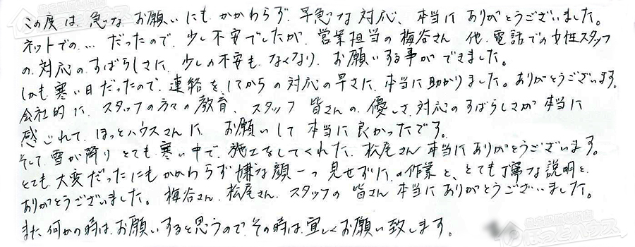 しかも、寒い日だったので、連絡をしてからの対応の早さに、本当に助かりました。ありがとうございます。