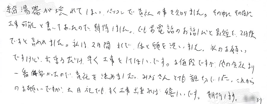 給湯器が壊れてしまい、パソコンで貴社の事を知りました。その中にその日に