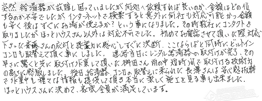 後日給湯器、コンロの取替えに来られた長澤さんは安心感抜群で作業中も様々な情報を提供して頂き、本当に楽しく施工を見る事も出来ました。