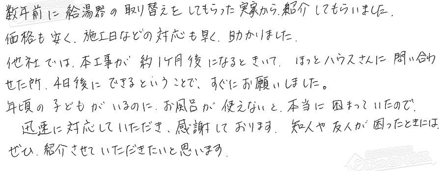 数年前に給湯器の取り替えをしてもらった実家から紹介してもらいました。