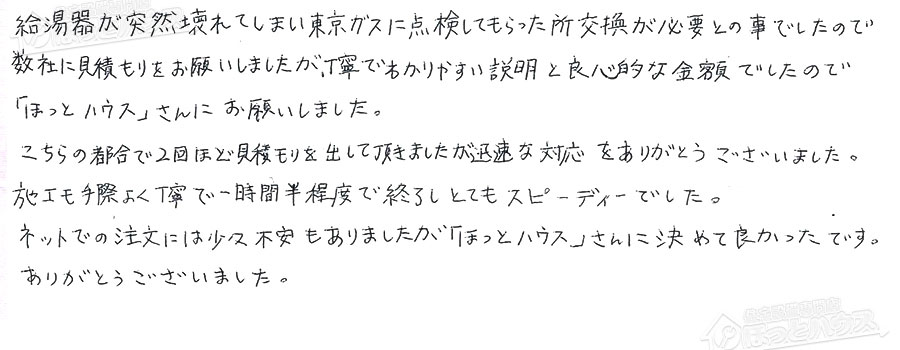 給湯器が突然壊れてしまい東京ガスに点検してもらった所交換が必要との事でしたので