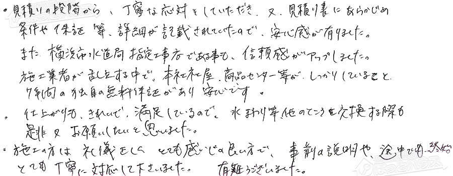 また、横浜市水道局指定工事店である事も、信頼感がアップしました。