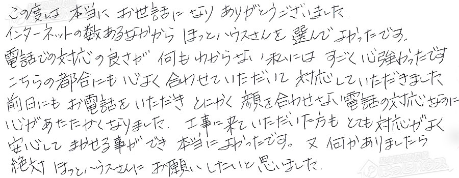 インターネットの数あるなかからほっとハウスさんを選んでよかったです。