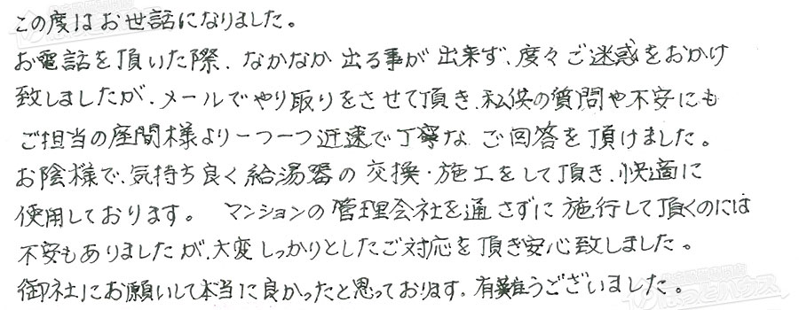 お陰様で、気持ち良く給湯器の交換、施工をして頂き、快適に