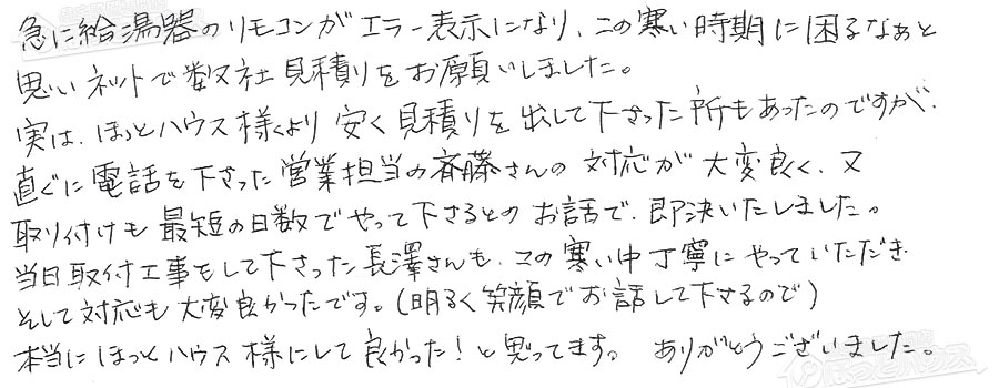 本当にほっとハウス様にして良かった!と思ってます。ありがとうございました。