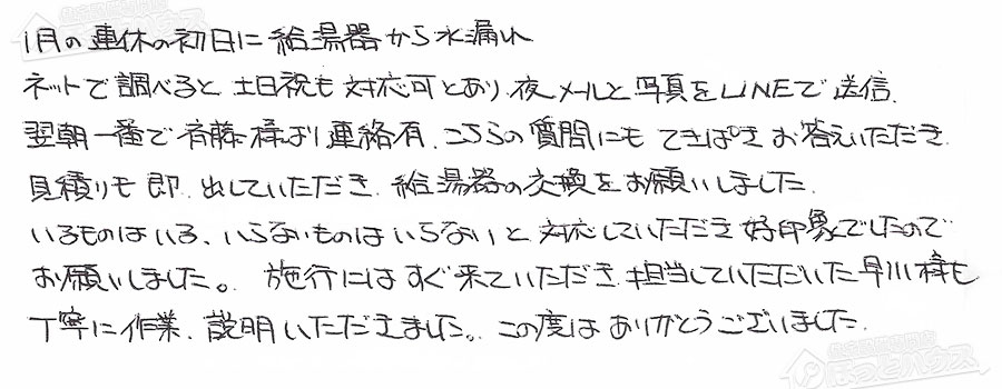 見積りも即、出していただき、給湯器の交換をお願いしました。