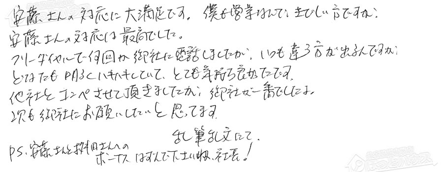安藤さんの対応に大満足です。僕も営業なんで、きびしい方ですが、