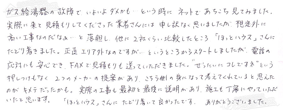 いたと思います。「ほっとハウス」さんにたどり着いて良かったです。ありがとうございました。