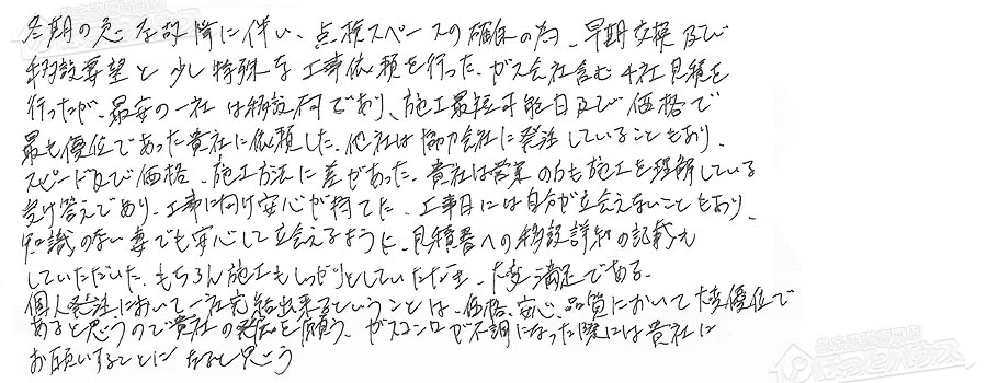 スピード及び価格、施工方法に差があった。貴社は営業の方も施工を理解している