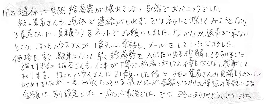 価格も、安く、親身になって、早く給湯器を入れたい事も理解してもらいました。